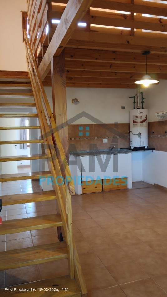 Comedor y cocina integrada, baño completo y dormitorio. Planta alta tipo Loft segundo dormitorio.